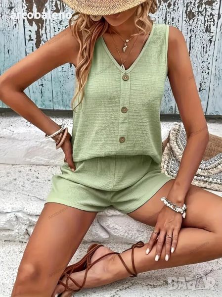 Свободен дамски ежедневен комплект без ръкави с V-образно деколте и копчета от две части