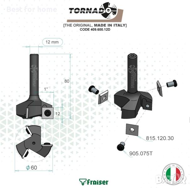 Фреза за дърва Tornado е с диаметър 60 мм и прът 12 мм. Оборудвана е с 3 сменяеми ножа по 12 мм заточени от 4 страни.