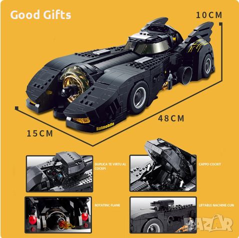 Феновете на Батман и всеки, който оценява супер автомобилите, ще харесат този супер автомобил. Тази красива детайлна играчка от тухлички, възпроизвежда класическите извивки на известния Батмобил, както се вижда във филма за Батман от 1989 г. С дължина над 43 см и зашеметяващ набор от 1 778 части, моделът предлага построяване, пълно с удовлетворение.