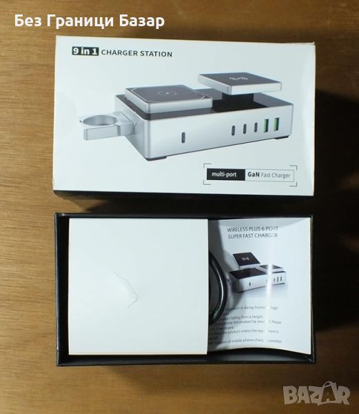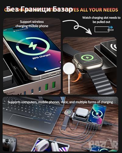 9 в 1 станция за зареждане: Осигурява 6 USB порта (100W+45W+30W+15W+15W+10W) и две безжични зони за зареждане (15W+10W).