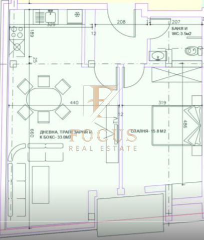 Апартаментът е 86 кв.м. със следното разпределение: хол с кухненски бокс, спалня, баня с тоалетна и тераса.