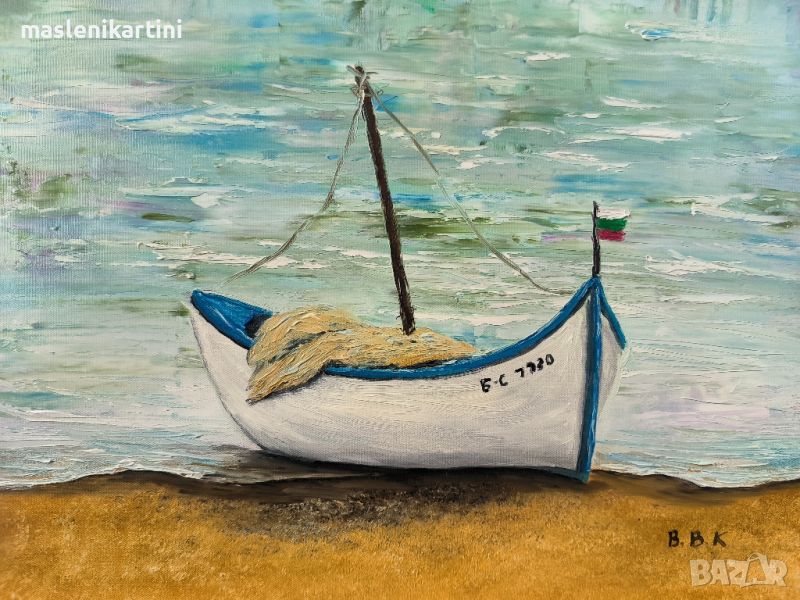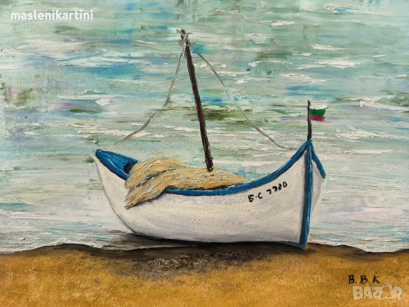 Рибарска българска лодка на морския бряг маслена картина → Обява 45539170