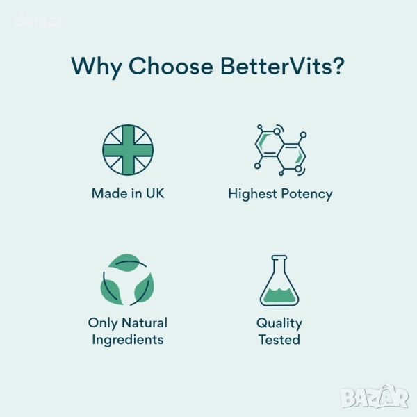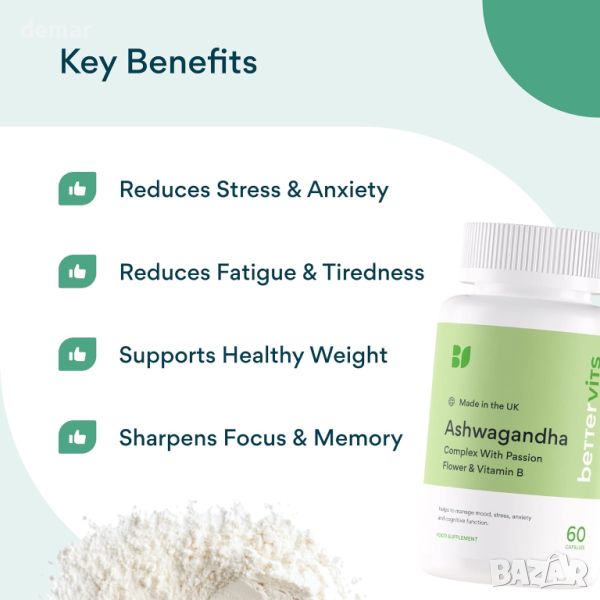 пасифлора за ефективно намаляване на нивата на кортизол, справяне със стреса и тревожността, като същевременно поддържа здравето на мозъка с витамини от група B. Тези съставки действат синергично като мощни антиоксиданти, подобряващи паметта, неврологичните функции и баланса на съня. Освен това, тази формула повишава фокуса и енергията, като ви помага да постигнете по-пълноценен начин на живот с подобрена умствена яснота и жизненост. Ashwagandha също играе решаваща роля за намаляване на кръвната захар, холестерола и възпалението, като допълнително се бори с неблагоприятните ефекти на съвременния живот. Гордо една от най-бързо развиващите се марки добавки в Обединеното кралство, BetterVits предлага местно произведени, висококачествени хранителни продукти, водени от съвременни формули и отдаденост към съвършенство.