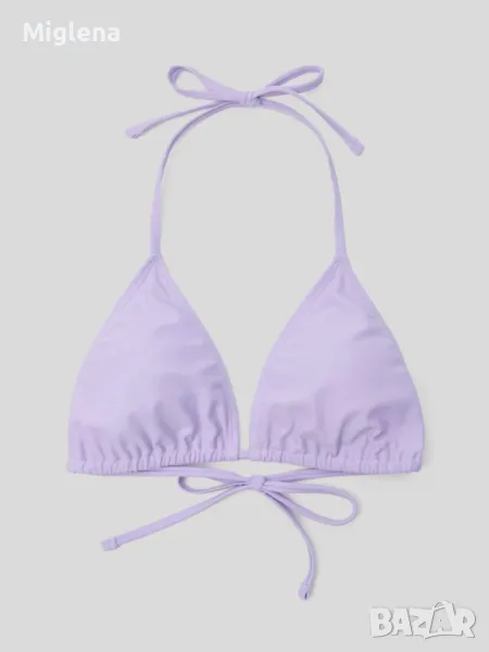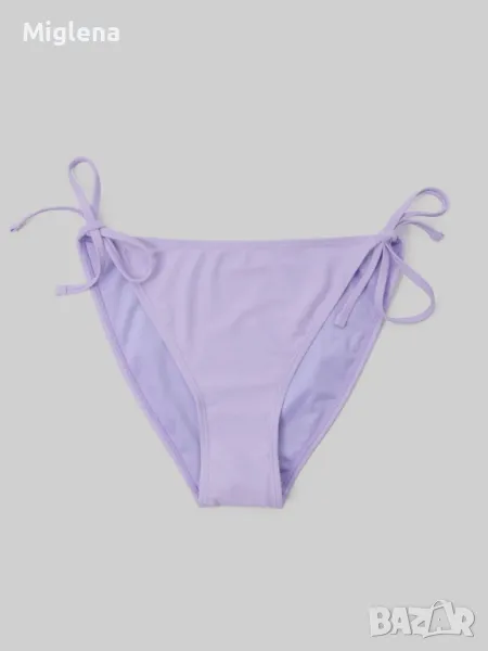 Дамски бански в нежно лилаво. Горнището е с подвижни подплънки, долнището е тип изрязана бикина с връзки за регулиране. Страхотно предложение за вашата перфектна плажна визия. Размер S по етикет, но става и за М. Банският е на марката Sinsay. Обличан е само веднъж за плажна фотосесия.