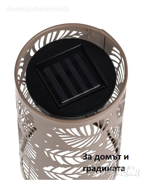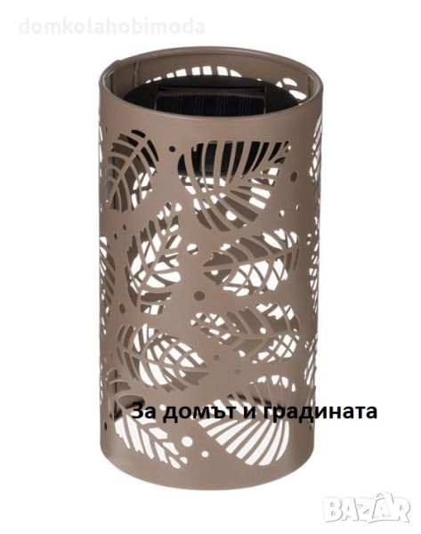 Подови соларни фенери Кафяв цилиндър Перфорирани листове Ø10x18cm Описание - Характеристики Кафяв цилиндричен соларен фенер с дизайн на перфорирани тропически листа и бял светодиод. Свети автоматично през нощта. Има акумулаторна батерия и превключвател за включване/изключване. Захранван от слънчева светлина, без кабел, екологично чист. Цвят кафе Материал на продукта Метал