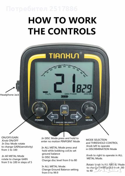 2. Дискриминация по проводимост на металите от 0 до 100 - Позволява на потребителя да игнорира боклука и други нежелани обекти.