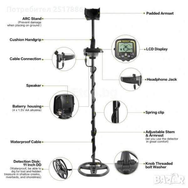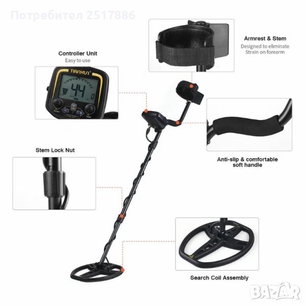• LCD екран: Включва LCD екран, който показва информация за открития метален обект, което улеснява идентифицирането и локализирането му.