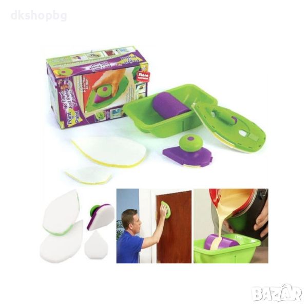 Четките са в два различни размера - малка и голяма. Голямата четка дава възможност за поставяне на удължителна дръжка, която е стандартна. Продава се във всички големи вериги и магазини за битови стоки. Въртейки се във всички посоки, тя прави боядисването лесно. Не натоварва кръста или ръката. Чрез нея се достига с лекота до тавана. Малката четка е снабдена с кръгла дръжка, чието предназначение е да изпипва детайлите, да боядисва ъглите и неудобните за достигане места, рамките на прозорците или вратите, до контакти, тесни пространства и много други. Комплектът съдържа два дунапренени валяка, които са във формата на ютия. Чрез тях много удобно се боядисват по-труднодостъпни и малки пространства. Това има дава голямо предимство пред валяците и четките. Отсичат перфектно без да цапат, без да се стича боя, да се подлива или изцапва всичко около вас. Двете четки (валяци) поемат нужното количество боя от специално конструираната за това роторна ваничка. Тя разпределя перфектно съдържанието и количеството боя по четката. Частите на комплекта са изработени от пластмаса. Те са в свеж елен и лилав цвят.