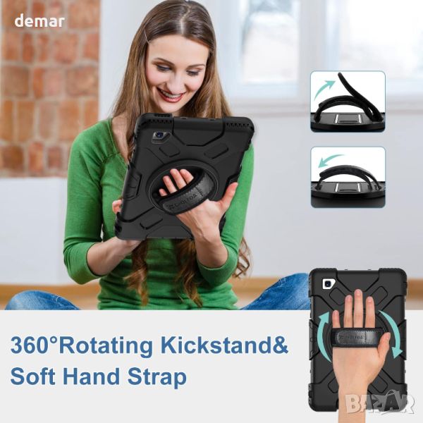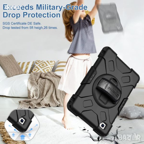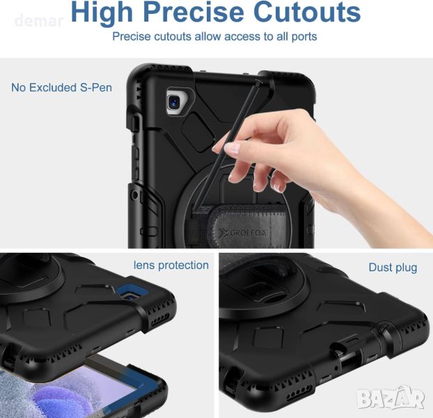 Проектиран за Samsung Galaxy Tab A7 Lite 8,7 инча 2021 (SM-T220/SM-T225), този защитен калъф се отличава с издръжлива трислойна конструкция от висококачествен твърд компютър и мек силикон, предлагаща устойчивост на удар на цялото тяло, която успешно премина 26-кратен тест за падане от 15 фута. Включва прецизен изрязан дизайн за лесен достъп до всички портове и вграден държач за S-писалка (S-писалката не е включена) за магнитно закрепване и удобна употреба. Калъфът разполага и с въртяща се на 360° стойка с три регулируеми ъгъла за разнообразни позиции за гледане и писане, заедно с регулируема презрамка за ръка и подвижна презрамка за безопасно боравене и носене.