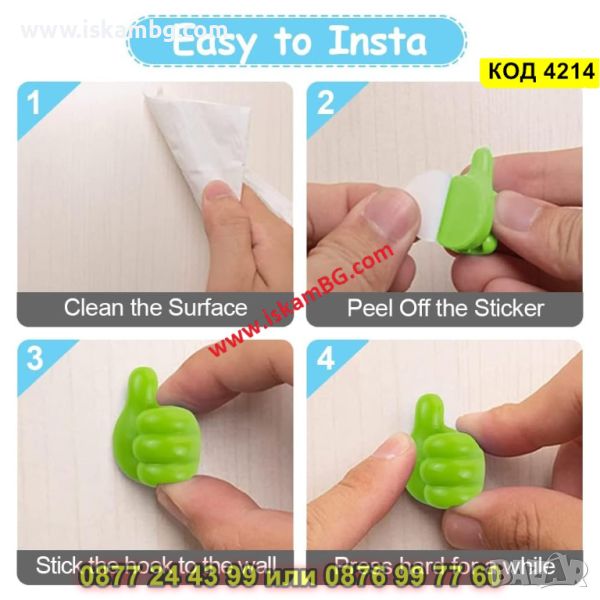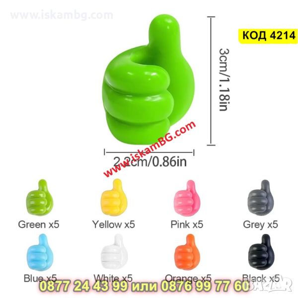Това са едни забавни и същевремено функционални и практични държащи за кабели във форма на палец. Самозалепват се, а поставянето им се осъществява чрез мощното им лепило на гърба на всеки един от тях. Могат да бъдат поставени на различни повърхности, гарантирайки Ви дълготрайно и надеждно ползване. Това че са създадени от висококачествен силиконов гел ги прави безвредни за околната среда и екологично чисти. Добавете забава и игривост във Вашия интериор с тези закачливи държачи във форма на палец. С тях ще имате възможност да организирате, както кабелите си, така и кухненски прибори, очила или ключове. Приблизителните им размери са: 2 х 3 см.