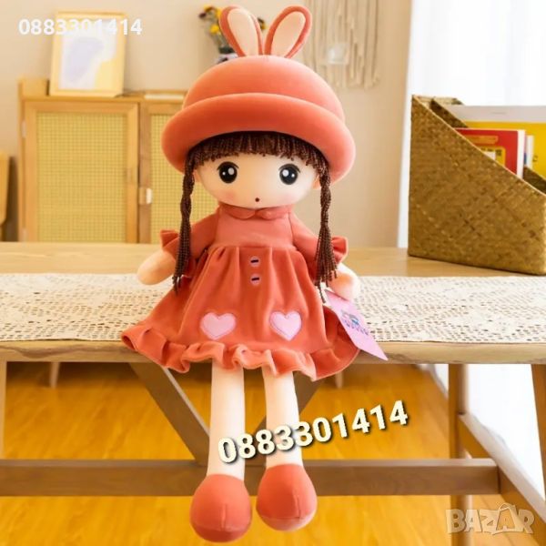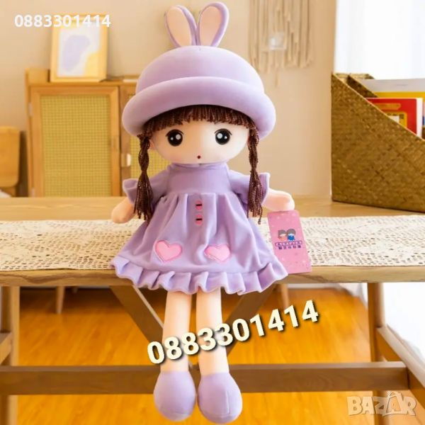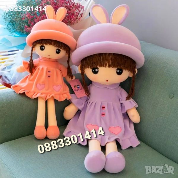 Плюшена нежна кукла с рокля и шапка заешки уши. Качествена изработка и приятна на допир материя. Бродирани елементи, без малки падащи части - за безопасност.