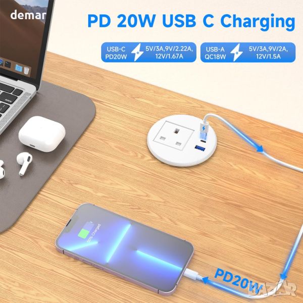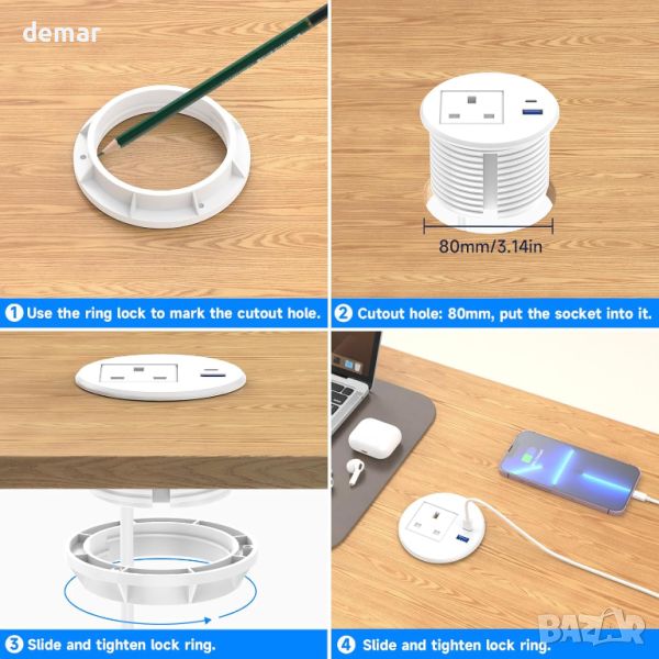 Ohuo Desk Grommet Power Socket 80 мм е скрит разклонител, предназначен за ефективно управление на кабелите в дома и офиса. Пасва добре в отвор от 80 мм, което го прави стилно допълнение към бюра, кухненски плотове и нощни шкафчета. Това устройство включва PD 20W USB-C порт за зареждане с изходни спецификации от 5V 3A, 9V 2.22A и 12V 1.66A, заедно с USB-A изход от 5V/3A, 9V/2A, 12V/1.5A, улесняващ бързото зареждане на устройства, захранвани от USB. Неговият спестяващ място дизайн позволява безпроблемно интегриране във всяко работно пространство. Инсталирането е лесно, изисква само маркиран и пробит 80 мм отвор и включва AC контакт, способен да работи с до 2500 W.