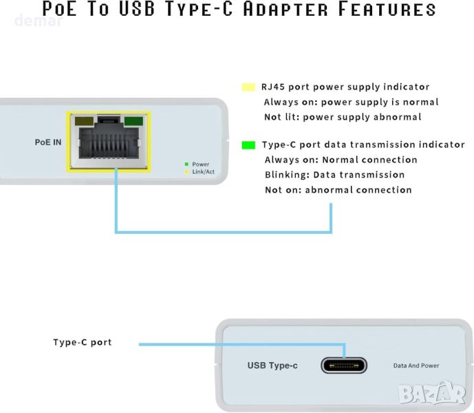 PROCET PoE+ към Type C Ethernet адаптер конвертор 23W,IEEE802.3at PD3.0 захранване и данни към USB С