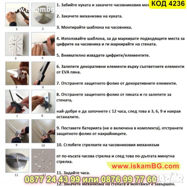 Стрелките на часовника се монтират без пробиване, чрез двойнолепящо тиксо. Лентата е на гърба на всеки елемент.