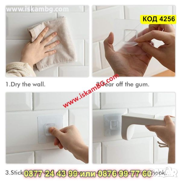 3. Залепете го на избраното място и натиснете. Задръжте за 1 минута. За по-добра адхезия изчакайте 24 часа за да изсъхне лепилото, след което закачете приборите