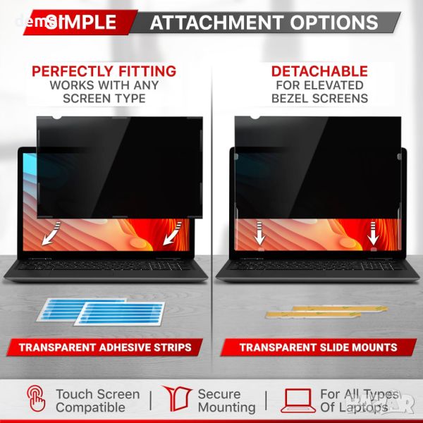 Екранният филтър за поверителност на лаптопа Vintez използва усъвършенствана технология с микро жалузи, за да осигури ясна видимост за потребителя, като същевременно кара екрана да изглежда тъмен от странични ъгли (30°-60°), подобрявайки неприкосновеността на личния живот в обществени пространства. Той е против отблясъци, устойчив на надраскване и също така служи като протектор за очите, като филтрира 96% UV лъчи и намалява синята светлина с 65%. Филтърът пасва на екрани с ширина 312 мм и височина 176 мм (съотношение 16:9). Уверете се, че измерванията са правилни, преди да поръчате. Пакетът включва лесни за използване ленти за закрепване и планки за плъзгащо се монтиране, с предоставени допълнителни монтажни комплекти.