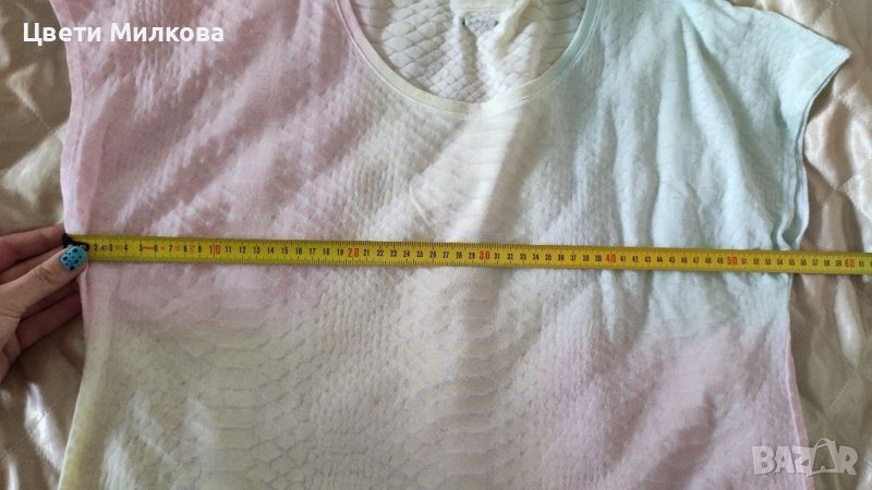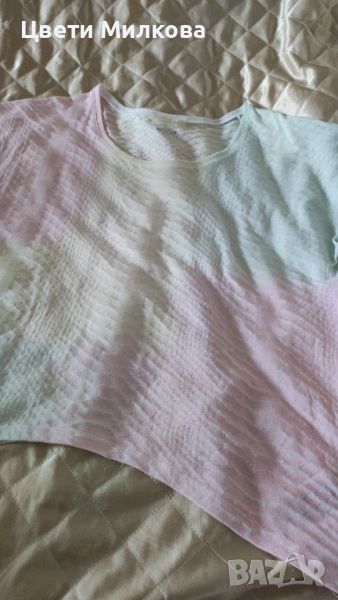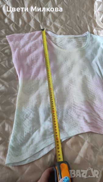 Блузата е оригинална и в отлично състояние! Модела ѝ е широк, затова е универсален размер, но прикачвам размери в сантиметри на снимките. С нежни преливащи се цветове (жълто, розаво, зелено).