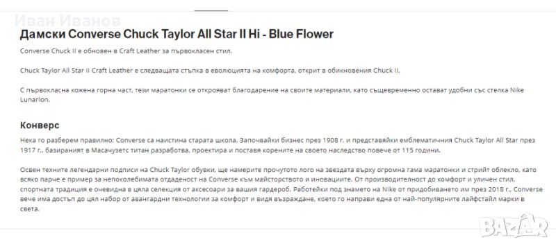 Chuck II Craft Leather High TopНови , Converse Chuck II Craft Leather е следващата стъпка в еволюцията на комфорта, открит в обикновения Chuck II. С първокласна кожена горна част, тези маратонки се открояват благодарение на материалите си, като същевременно остават удобни благодарение на стелката Nike Lunarlon.ЗАЩО ТРЯБВА ДА СИ ДОЛУПървокласна кожена горна частПодплатен неплъзгащ се езикПодплата от микроперфорирана кожаNike Lunarlon стелка за омекотяванеCHUCK TAYLOR ALL STAR II ORIGINSChuck Taylor All Star II е продължението на класическите маратонки All Star. Има същия силует, който познавате и обичате, но също така добавя леко омекотяване Nike Lunarlon. Това е Chuck, който е преработен с мисъл за вашия комфорт. Харесва ни да мислим, че това е нещо добро.Маратонки Converse. Можете да намерите повече от 300 модела, включително класическите. В допълнение към тях имаме множество уникални модели на Converse и лимитирани издания! Ако случайно търсите класическите бели Converse или висококачествени кожени обувки за зимата или есента? Не търсете повече! Класически модели на Chuck Taylor All Star, One Star или Converse Star Player. В Shooos можете да избирате от цени и оферти, които са най-добрите в Централна Европа.