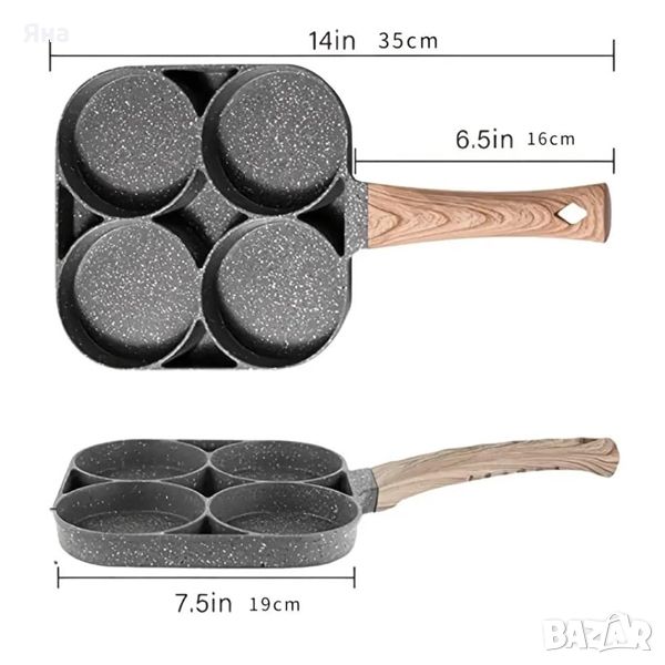 - Дизайнът с 4 дупки ви позволява да изпържите 4 яйца едновременно. Тиганът може да се използва за приготвяне на омлети, бургери, палачинки, десерти, яйца и др.