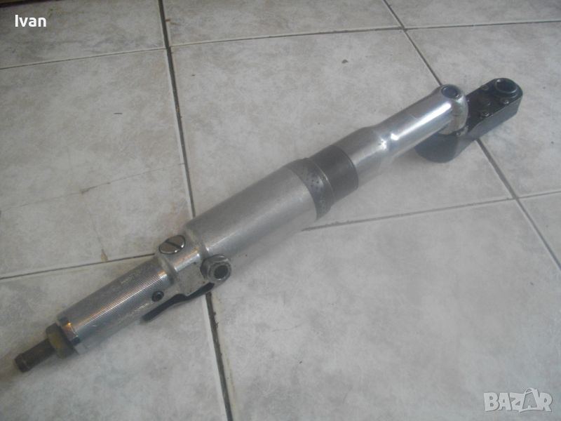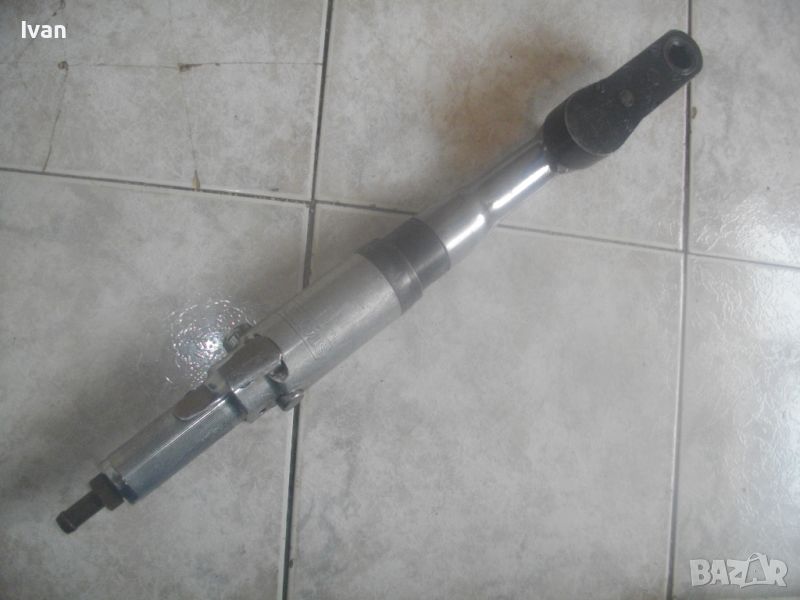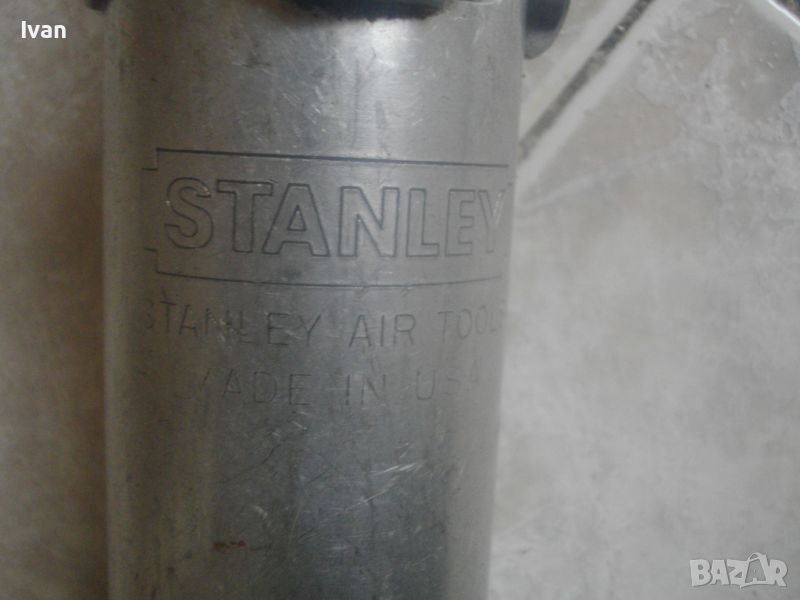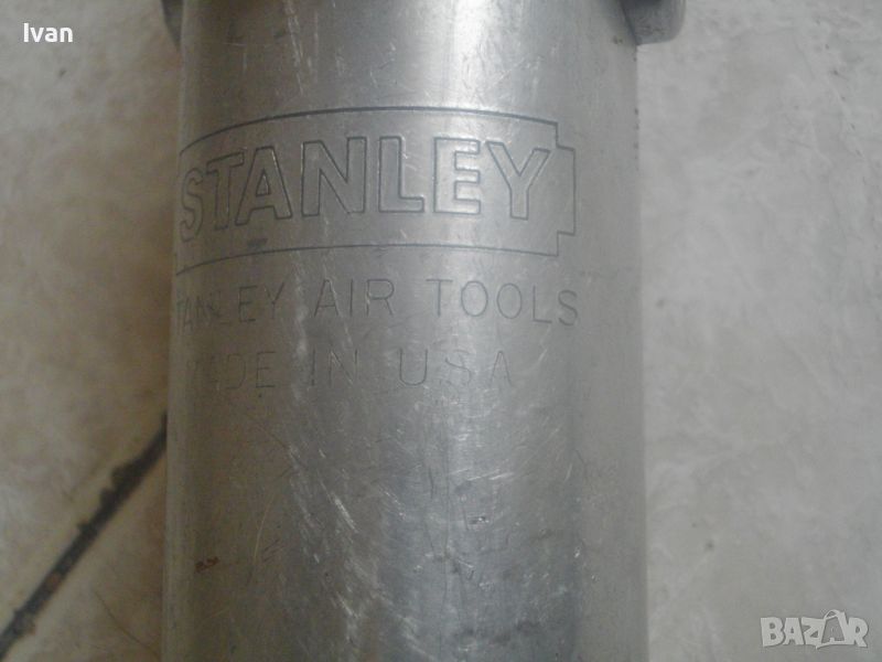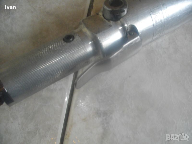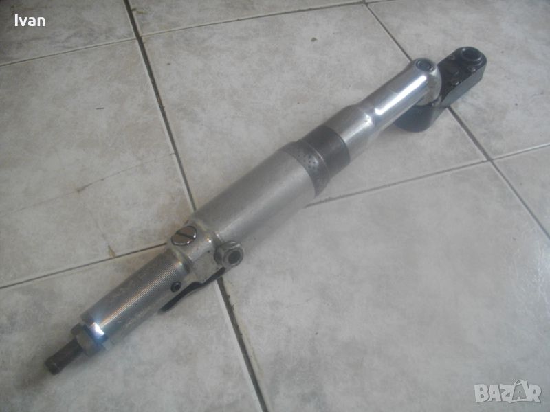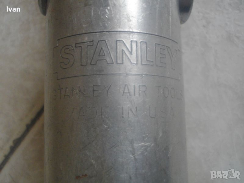 ОПИСАНИЕ на пневматична тресчотка за автосервизи и работилници. Цена 399 лв. Голяма, масивна. Оригинална САЩ производство на Стенли. Марка и модел/маркировки - STANLEY Air Tools - Made in USA - Model F40L10TA-4R2.Дължина тресчотката - 54 см. Поставен оригинален щуцер отзад. Масивна алуминиева средна и задна част на корпуса. Спусък удобен и дълъг метален. Предна част - плътна стомана с инокс неръжждавейка покритие. Глава на инструмента - закалена инструментална стомана. Ргулация скорост. Главата е за накрайник шестостен 18 мм. Тегло на инструмента - 4,0 кг. Цена - 399 лв.