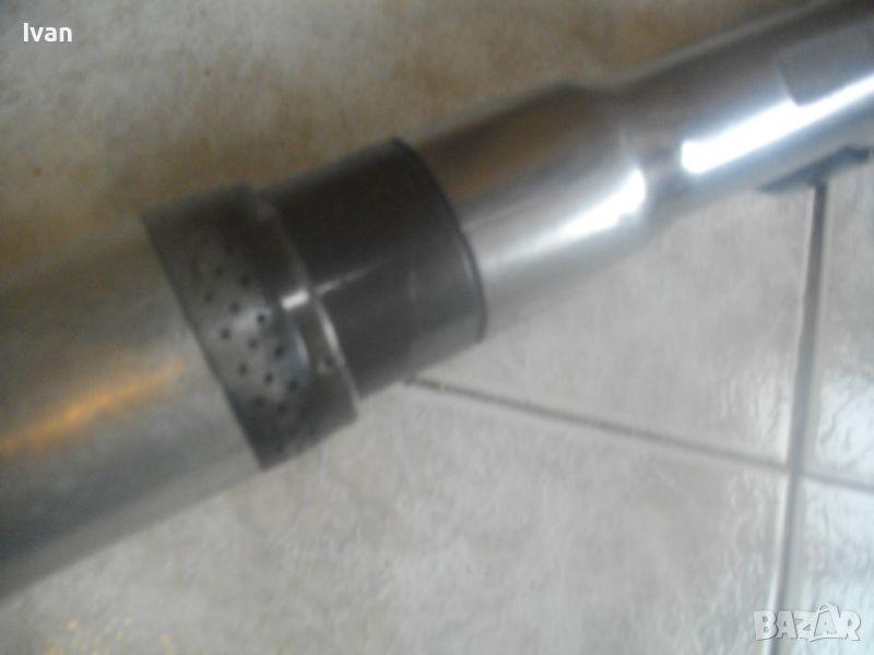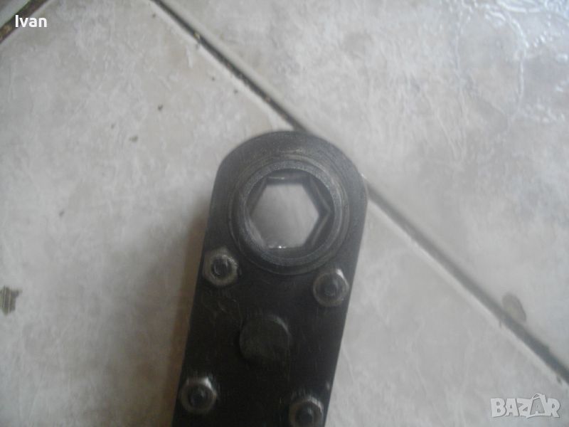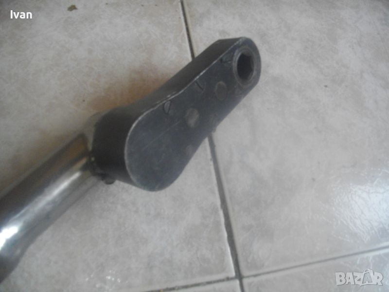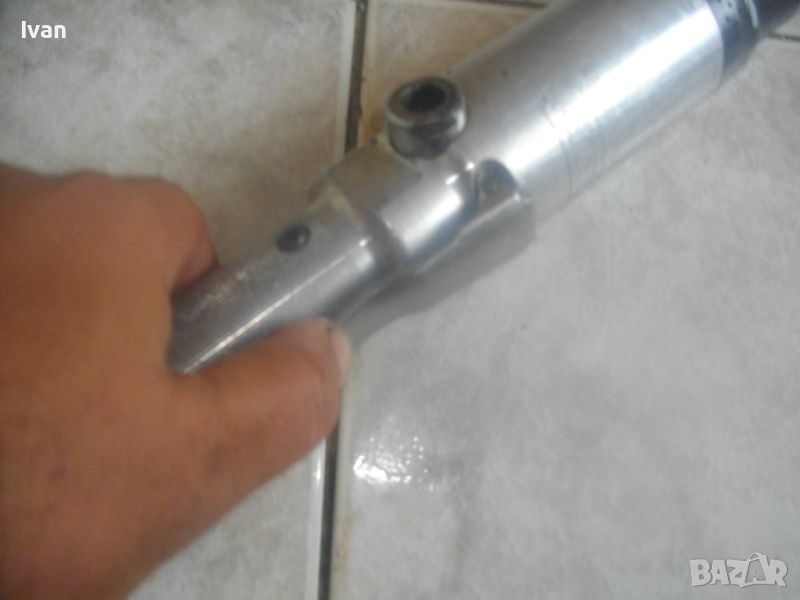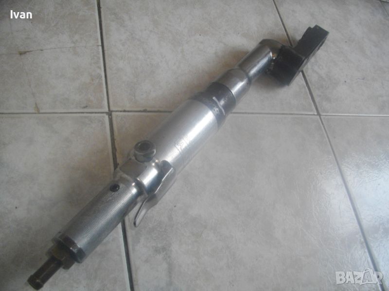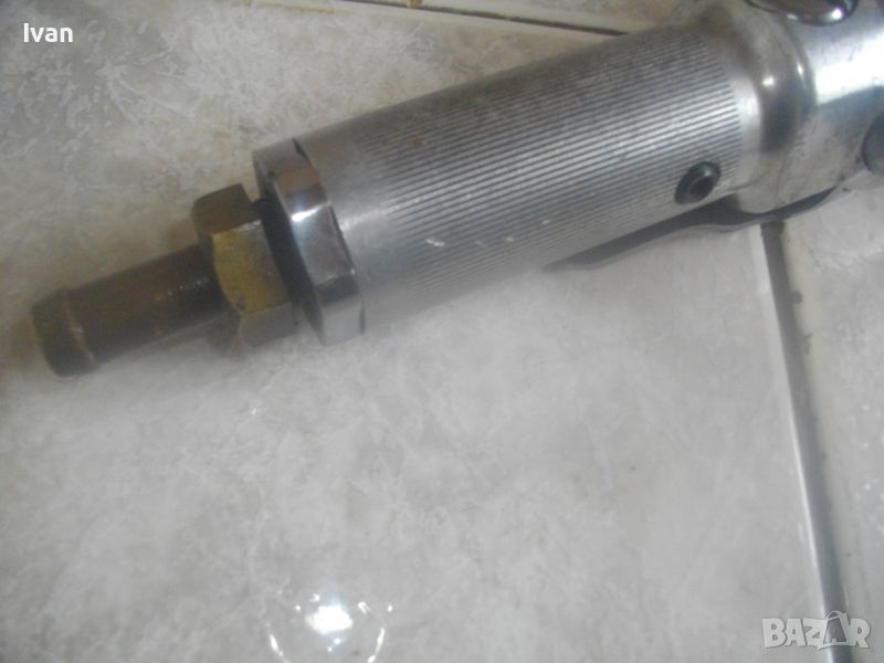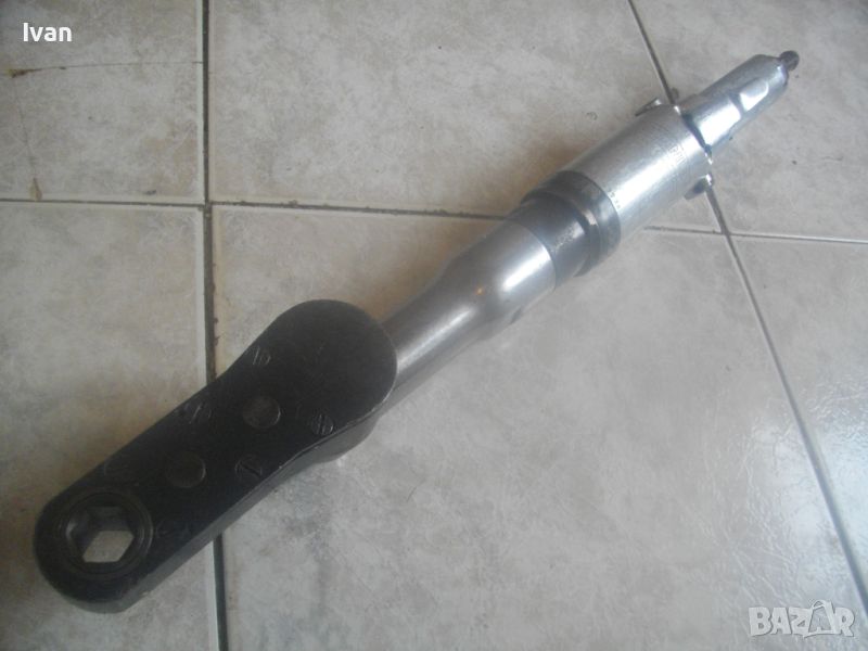 ОПИСАНИЕ на пневматична тресчотка за автосервизи и работилници. Цена 399 лв. Голяма, масивна. Оригинална САЩ производство на Стенли. Марка и модел/маркировки - STANLEY Air Tools - Made in USA - Model F40L10TA-4R2.Дължина тресчотката - 54 см. Поставен оригинален щуцер отзад. Масивна алуминиева средна и задна част на корпуса. Спусък удобен и дълъг метален. Предна част - плътна стомана с инокс неръжждавейка покритие. Глава на инструмента - закалена инструментална стомана. Ргулация скорост. Главата е за накрайник шестостен 18 мм. Тегло на инструмента - 4,0 кг. Цена - 399 лв.