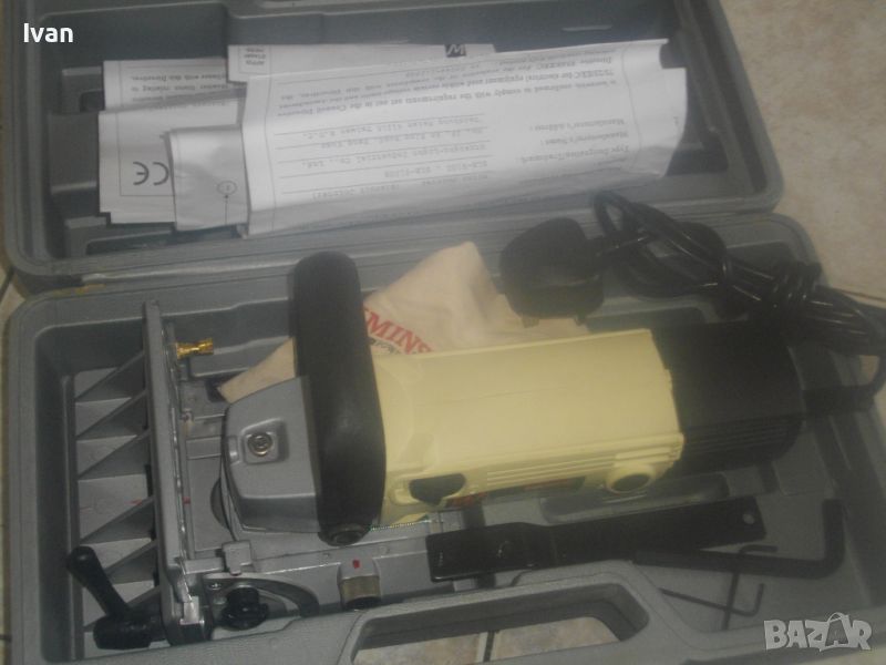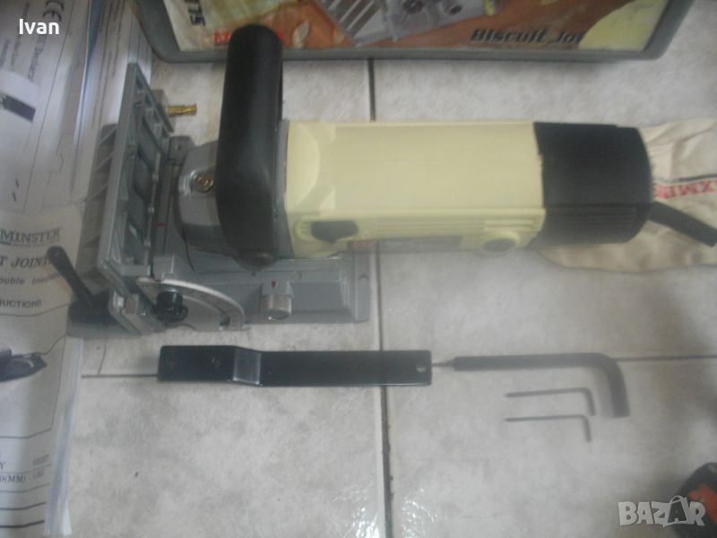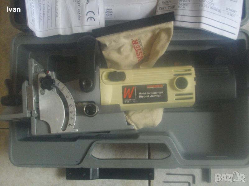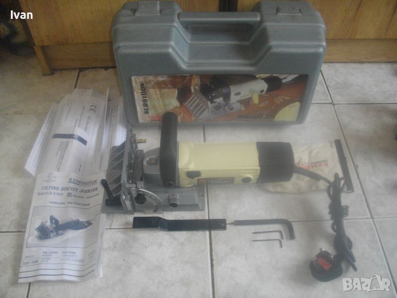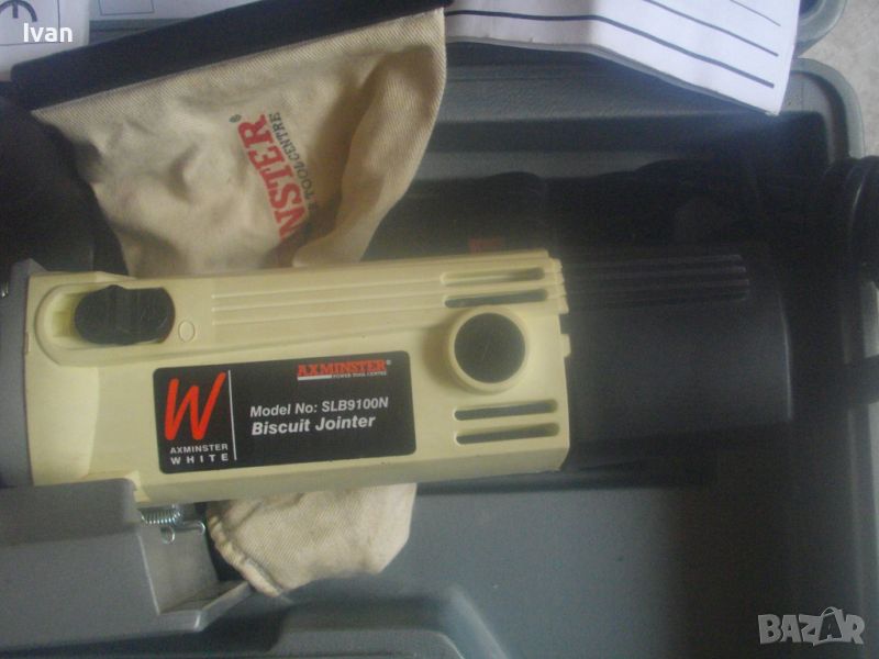 ОПИСАНИЕ на бисквит машина/челна нут фреза/ел. фреза за плоски дибли ламели AXMINSTER. Цена 429 лв. Точна марка и модел - AXMINSTER White SL B9100N. В оригиналния си куфар от твърда пластмаса. Марката е английска King Road, с базирано производство в Тайван.Машината е като нова, много малко ползвана, може би пускана за кратка работа веднъж/трудно различима от нова. С пълния си комплект. Мощност на мотора 700 вата, скорост 10 000 об/мин. Захранване 220-240 волта. С английски оригинален щепсел с бушон защита 6 ампеера 250 волта. Наклон на плота 0-90 градуса. Диск фрезов поставен като нов. За дискове размер универсален стандартен 4х22х100мм. Куфар на машината - като нов, с вградена дръжка. Размери 400х180х230 мм. Налична е оригиналната торба за прах към конектора наотпадъчнаа прах с логото на марката. Алуминиев плот. Машината е от лимитиран тиираж серия /бяла/ - AXMINSTER White Model SL B9100N Biscuit Jointer. Регулация дълбочина фрезоване 0-20 мм. Горна масивна дръжка. Книжки/указания инструкции за употреба, на англ.език. Четки на машината - външни. В комплекта са включени оригинални 3 бр. ключове шестостен шестограми и дълъг метален ключ за диска. Тегло само на машината - 3,2 кг. Тегло с куфара - 5,0 кг. Цена на машина с куфара - 429 лв.