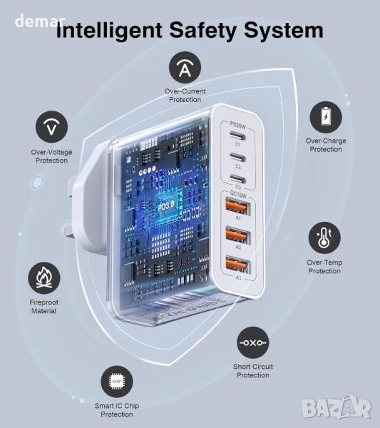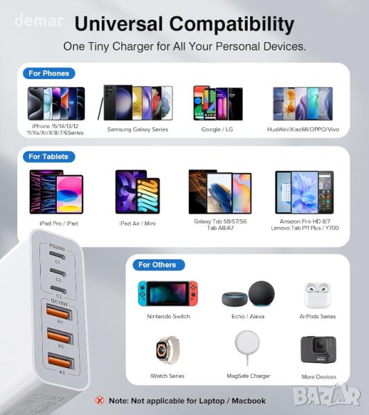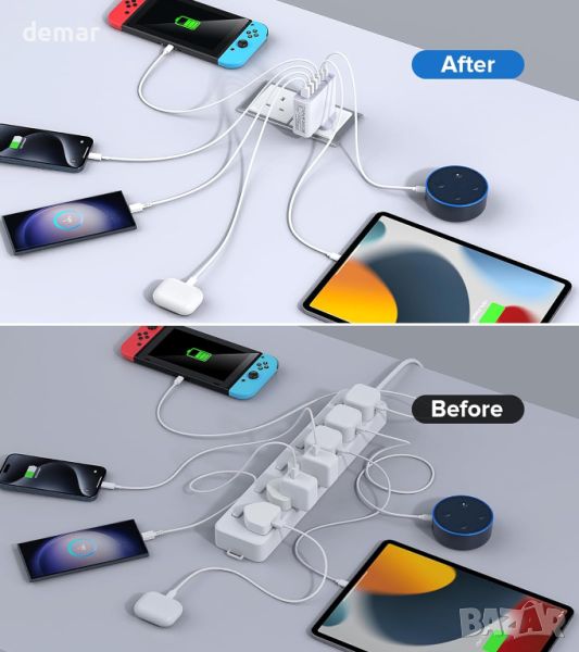 Това 100 W 6-в-1 USB зарядно устройство разполага с три USB-C PD 3.0 порта и три USB-A порта, поддържащи съответно до 20 W и 18 W изход. Той може да зарежда устройства като серия iPhone 15 и Samsung Galaxy S23 изключително бързо, предлагайки 58% заряд само за 30 минути за iPhone. Проектиран за универсална съвместимост, той работи с широк набор от устройства, включително таблети, AirPods и други. Компактният и преносим дизайн го прави идеален за пътуване и включва множество функции за безопасност за защита срещу свръхток и късо съединение.