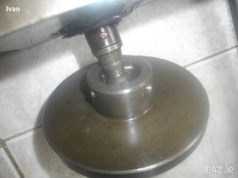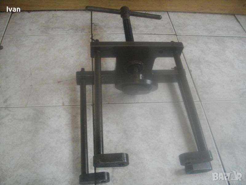 ОПИСАНИЕ на специализирана авторемонтна голяма винтова скоба - стяга. Приложение - за авторемонтни дейности в автосервизи и работилници. Предназначение - за ремонт на пружини амортисьори. Цена на инструмента - 659 лв. Италиански, от автосервиз в Северна Италия. Маркировка - AR 6121.01.516.Като нова е скобата, почти нова/трудно различима от нова. Изцяло от закалена инструментална стомана по всичките си части. Масивна. Тип винтова. Височина със затворен до край винт - 40 см, с отворен винт разгъната височина 58 см. Пресата е с ябълковидна глава кръгла диаметър ф 115 мм, със съчми за въртеливо изцяло движение на гглавата. Глава - инструмеентална стомана закалена. Възможност за ругулация на 4 странични рамена - отзад дължина 315 мм, отпред 240 мм. Винтов болт по средата ф 30 мм, върток отгоре дължина 260 мм. Регулацията на рамената за ширина отпред 160мм - 200 мм, отзад 240мм - 290 мм. Стоманата по скобата преса е изцяло дебела масивна 16 мм. Тегло на пресата - 10,00 кг.