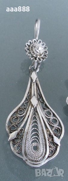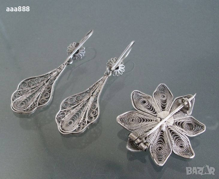 Комплект обеци и брошка от филигранно сребро проба 950/1000, общо тегло 10.10 грама, ръчна изработка. Цена за комплекта 142 €. Поотделно описание и цени както следва: