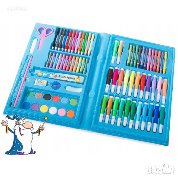 Насладете се на безкрайни часове на творчество с нашия детски комплект за рисуване, който включва цели 86 части! Всичко, което вашият млад художник се нуждае, се събира в практичен пластмасов калъф - от моливи и флумастери до пастели и акварелни бои. Лек и удобен за пренасяне, този комплект е перфектният спътник за всяка детска градина, училище или където и да отидете. Нека децата развият своето въображение и креативност с нашия комплект за рисуване - забавление за цялото семейство!
