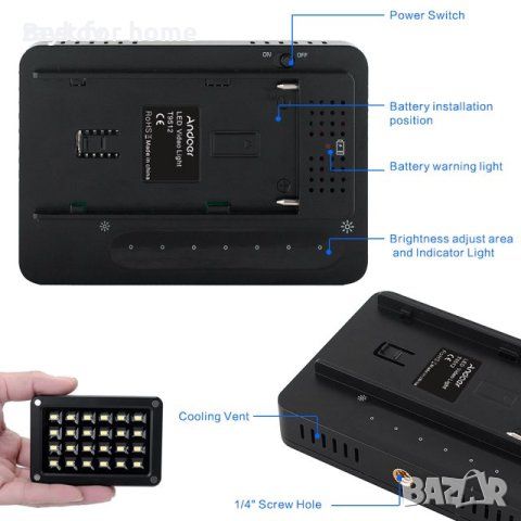 Мини преносима видео лампа,Andoer T9512,2 бр Филтри-бял и оранжев,Panel 95+ 5500K, 24 LED за камера