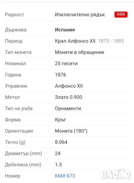 Златна монета 25 песети 1876 ( MS 65+) НАЙ РЯДКАТА ! → Обява 45579700