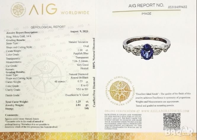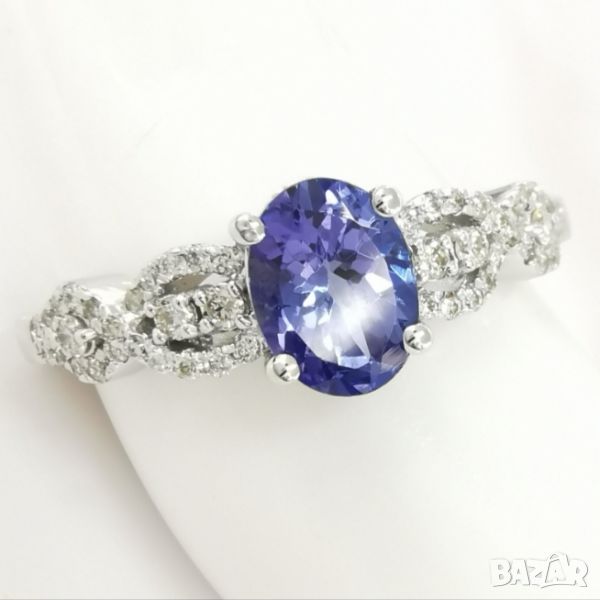 Дамски пръстен с 💯 % Естествен Танзанит 1,00ct. и 48 диаманта,AIG сертификат ,бяло злато → Обява 45581545