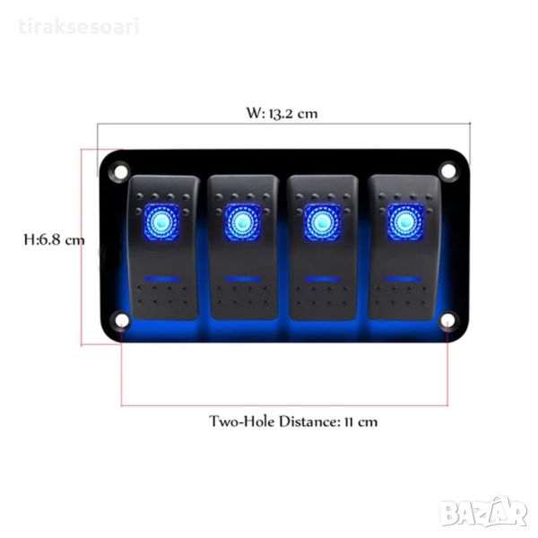 Включва 4 превключвателя за включване и изключване със син светодиод.