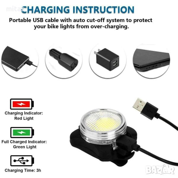 /2 в 1/ LED фар и стоп за велосипед, Бяла и червена светлина, USB