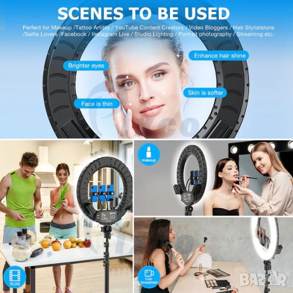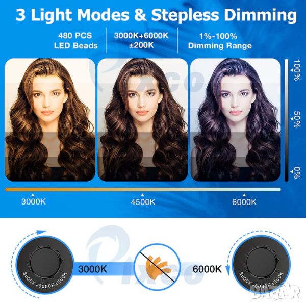 【Регулиране на двуцветна температура и яркост】 18-инчова пръстеновидна светлина с множество варианти на осветление (варираща от 3000K до 6000K цветна температура без промяна на цветния филтър, 10%-100% регулируема яркост).