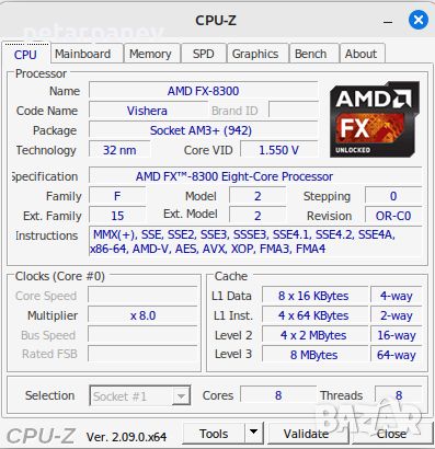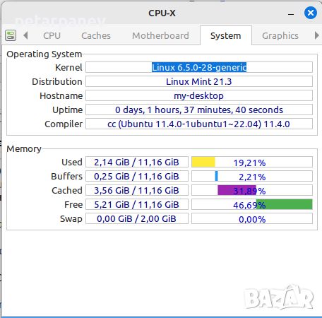 Настолен компютър в идеално състояние.Никакви проблеми по хардуер и софтуер.Нова инсталация , направена профилактика ,качено всичко необходимо за нормална употреба.Много бърз , много тих и с много добра производителност.Надеждна машина подходяща за интернет , мултимедия , офис приложения и игри. С една забележка на последната снимка - счупен sata2 connector . Linux Mint 21.3 Virginia base: Ubuntu 22.04 jammy- ПроцесорAMD FX(tm)-8300 Eight-Core Processor- Оперативна памет12GB Двуканална DDR3- Дънна платкаGigabyte Technology Co. Ltd. GA-78LMT-USB3 6.0 (Socket M2)- ГрафикаAMD RS780L [Radeon 3000] vendor: Gigabyte driver- Storage1.Intel model: SSDSC2BF240A5L size: 223.57 GiB speed: 3.0 Gb/s type: SSD2.Western Digital model: WD5000AAKX-001CA0 size: 465.76 GiB- ЗвукAMD RS780 HDMI Audio [Radeon 3000/3100 / HD 3200/3300]