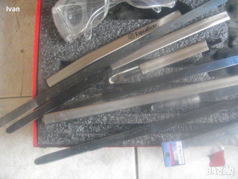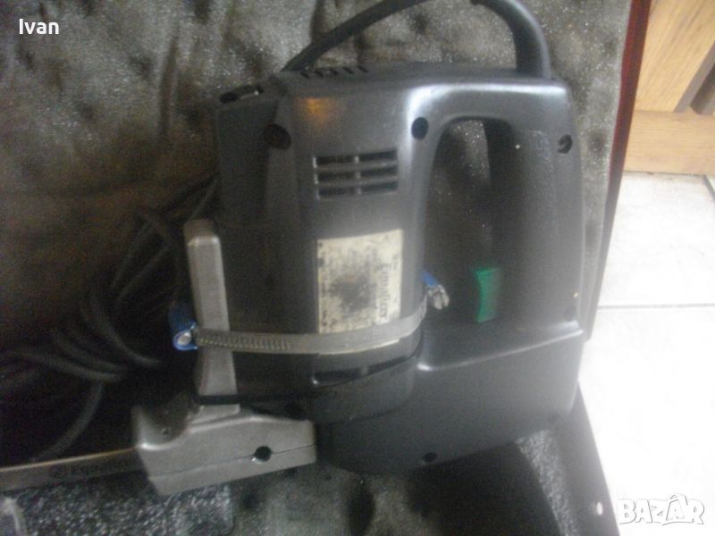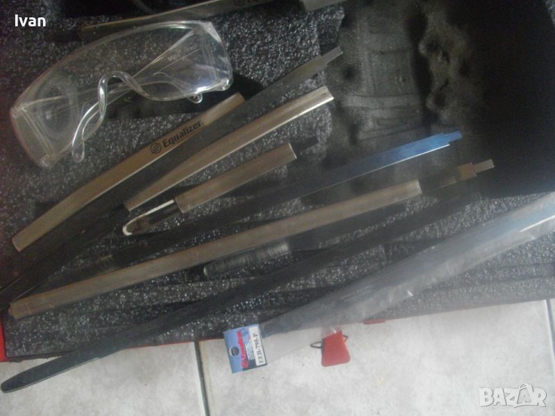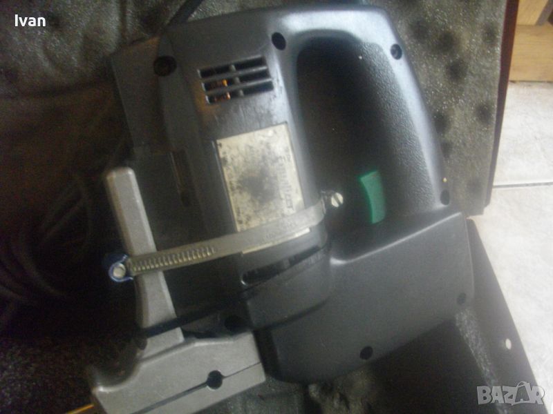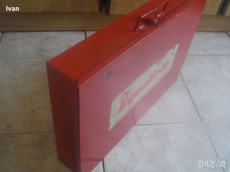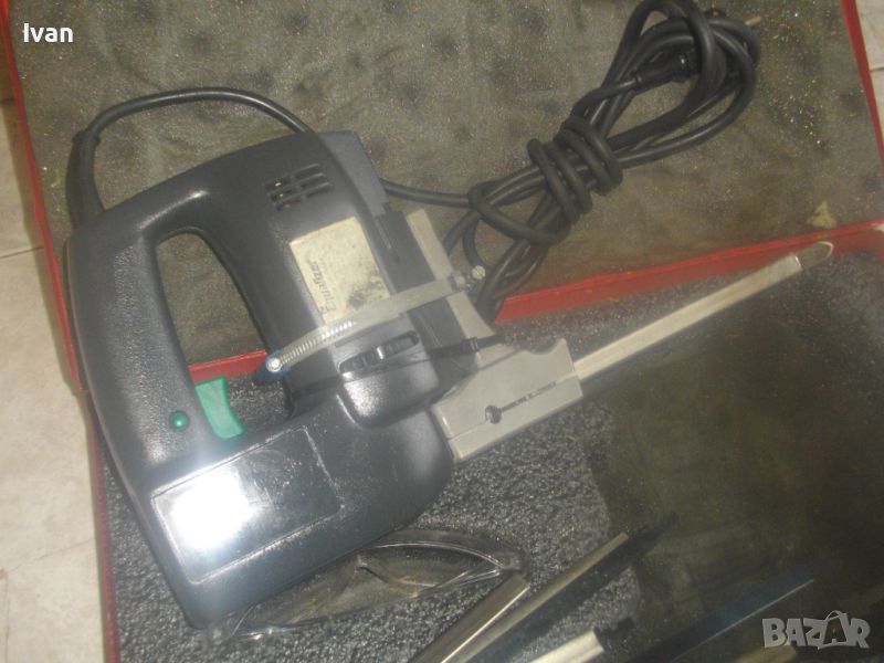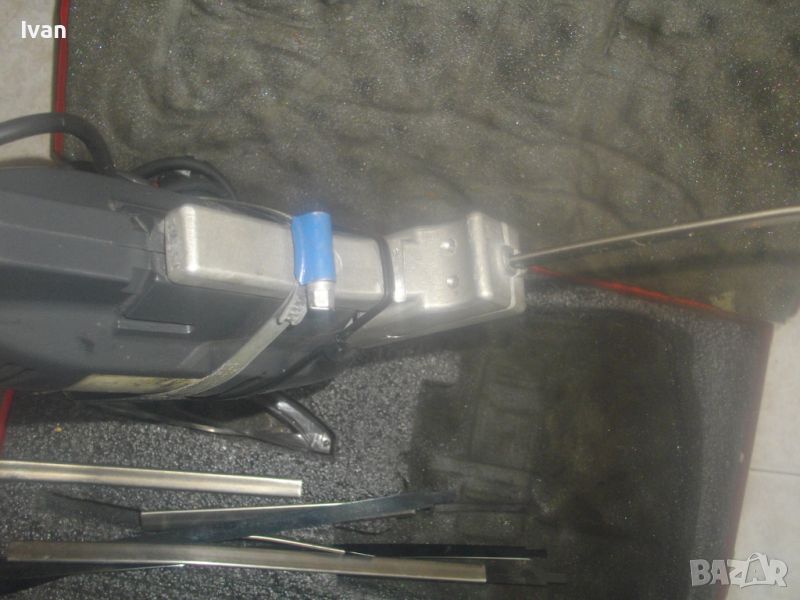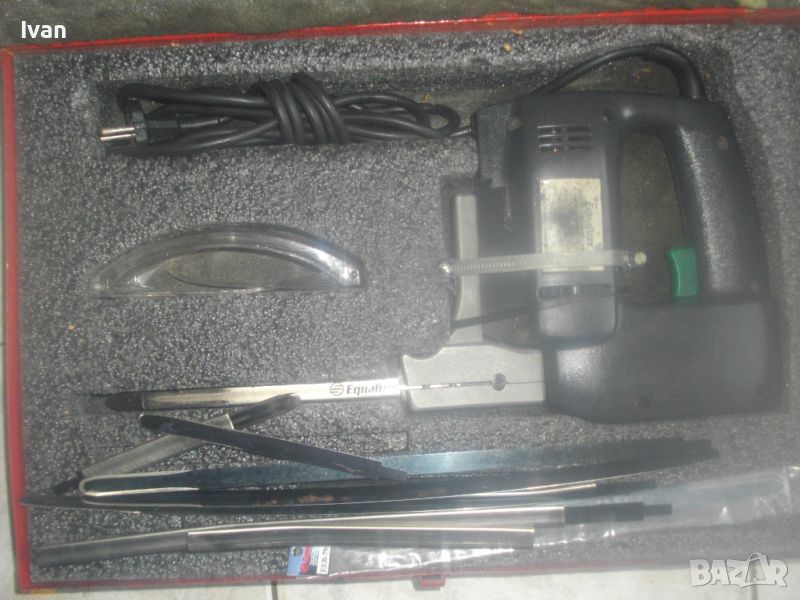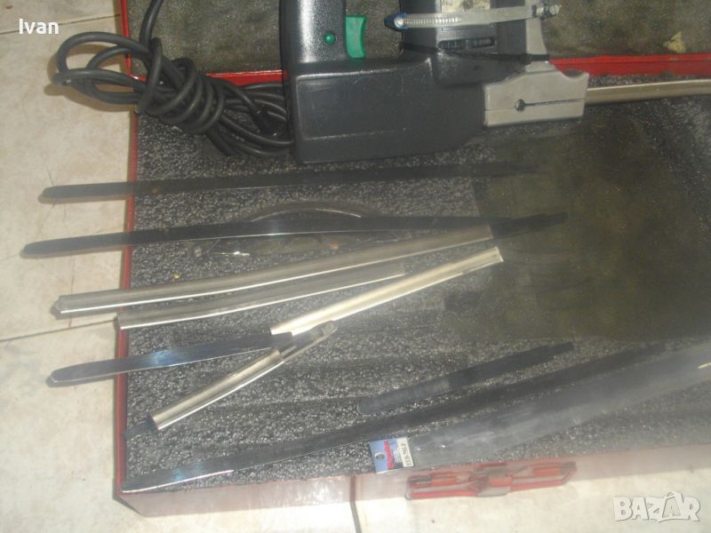 ОПИСАНИЕ на САЩ ел. машина за сваляне на автостъкла професионална в червен метален куфар - цена 399 лв. Машината е професионален клас за сваляне на автостъкла при автосервизни дейности. Американска марка с немско производство в Германия. Марка и модел маркировки - De EGUALIZER Hes Voor Uitsnijden Van Autoruiten Van Bivnenuit - EGUALIZER Classic - Egualizer Patented Word Wide. Модел EGUALIZER EEB - 795 P - TEXAS USA. Производител - Egualizer Industries GbmH Deutschland. Машинатае в оригинален метален червен куфар кутия с размери 470х310х80мм. С метална дръжка и копчалки в отлично състояние. Км комплекта има 9 ножа за сваляне на стъкла, от инструментална стомана, с различна дължина и с различни върхове /прави и фабрично закривени/. Дължина на ножовете - от 150 мм до 360 мм. Подежат на заточване от двете си страни. Отделно в комплекта има 3 бр. нови ножове в опаковка запечатана, оригинални на марката, с американско производство - Egualizer Texas USA. Машината работи много добре, с бързи движение на задвижване на поставен нож. Лека заележка по корпуса - има леко спукване на пластмаса отпред, което е поправено професионално и мястото е пристегнато с метална обтячка. Масивна алуминиева изцяло глава на машината със захват на нож посредством 4 болта. Куфар - с вложки. В комплекта има и нови неизоползвани предпазни професионални очила. Тегло на машината с куфара - 5,0 кг. Цена - 399 лв. Твърда, без коментар.