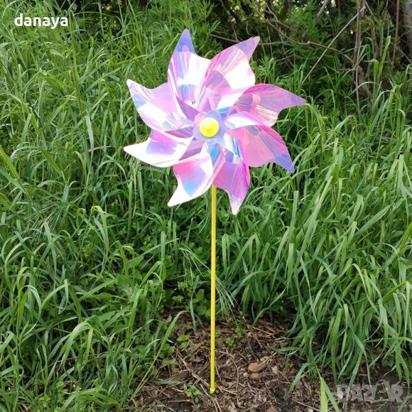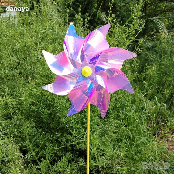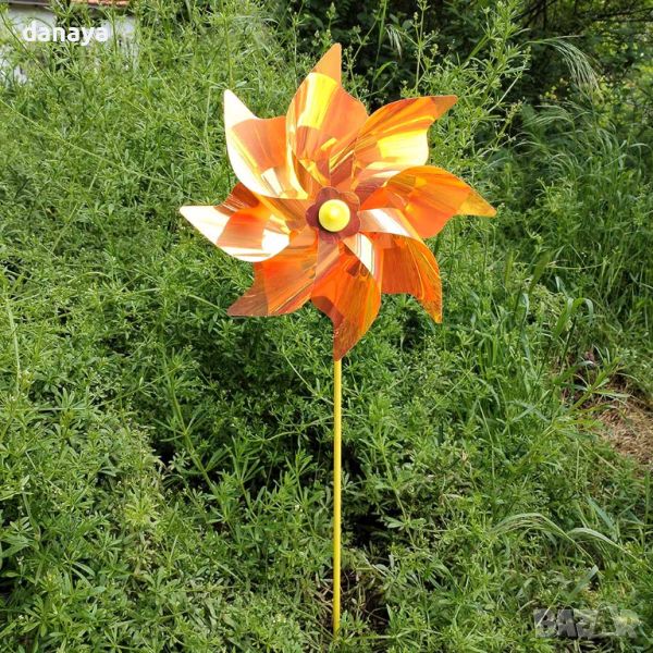 Голяма и ефектна вятърна ветровъртележка с неонови цветове, които се отразяват от слънцето и в зависимост къде ще я поставиш. Стои страшно ефектно в градината като декорация или в саксия.
