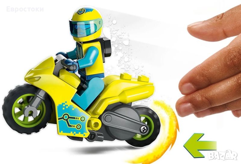 Сглобете всички части от конструктора LEGO City - Stuntz, Кибер каскадьорски мотоциклет и нека забавленията и игрите да започнат. Мотористът е готов за луди каскади, спиращи дъха. Готов е и да покаже впечатляващи трикове.