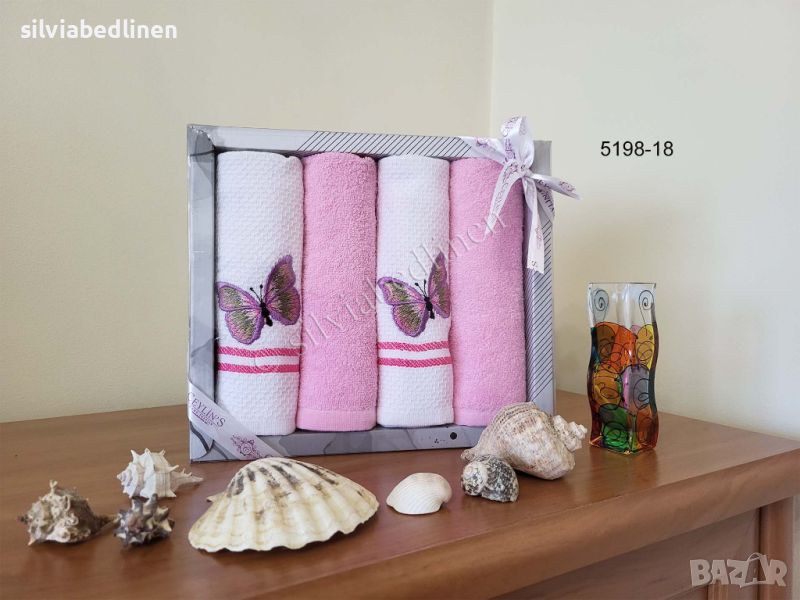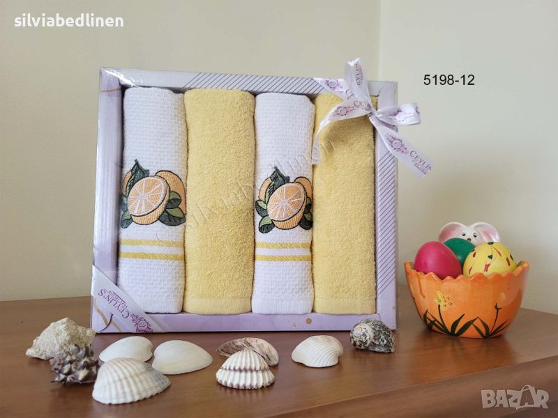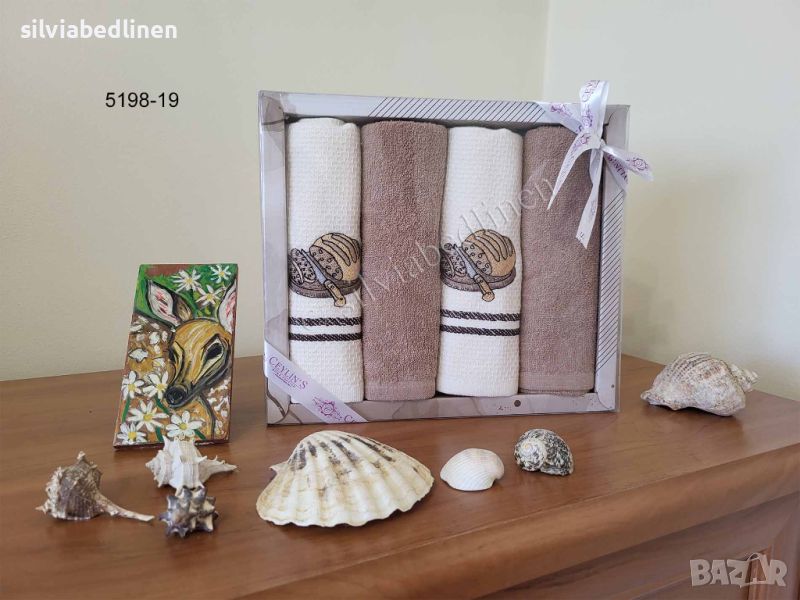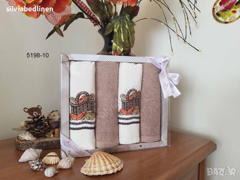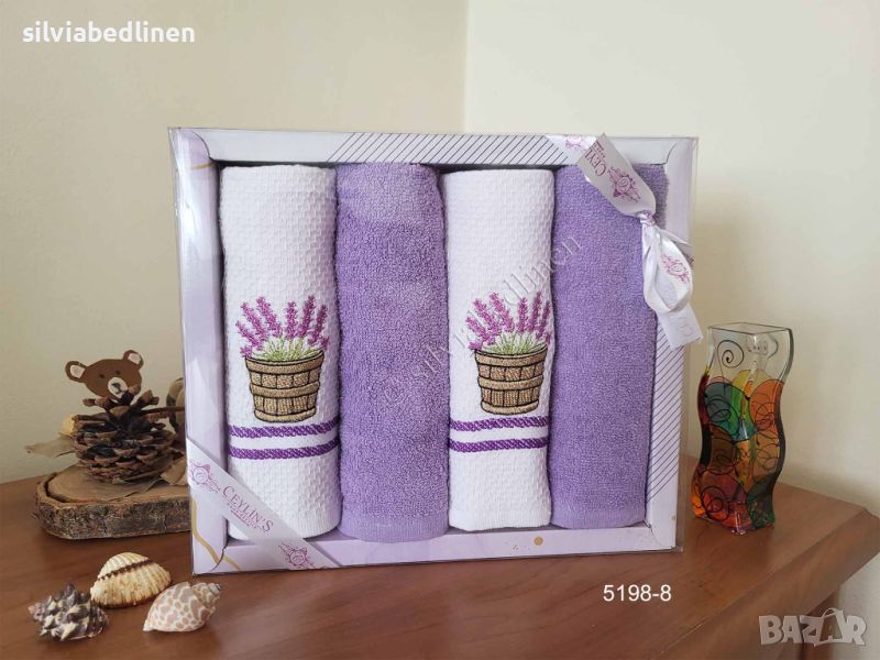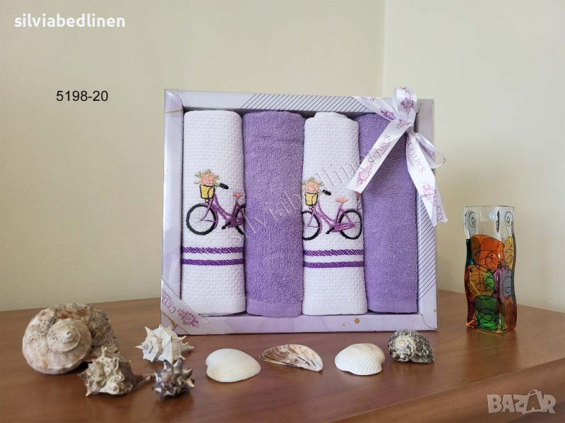 Комплект от четири броя памучни кърпи за кухнята - 2 вафелни и 2 хавлиени. Вафелните кърпи са с красива бродерия - велосипеди с кошници с цветя, а хавлиените кърпи са оцветени в лилаво. Кърпите са красиво опаковани в луксозна кутия с прозрачен капак и панделка, и са много подходящи за семпъл и практичен подарък.