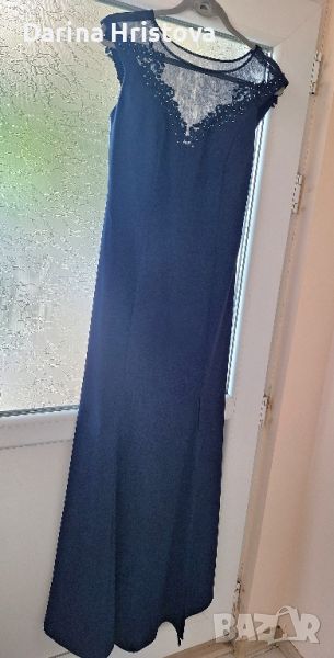 Продавам тъмно синя бална рокля. С ефектен гръб и камъчета, с цепка, която е дълга 71см. Цялата рокля е дълга 190/200см. Носена е с 14см ток.