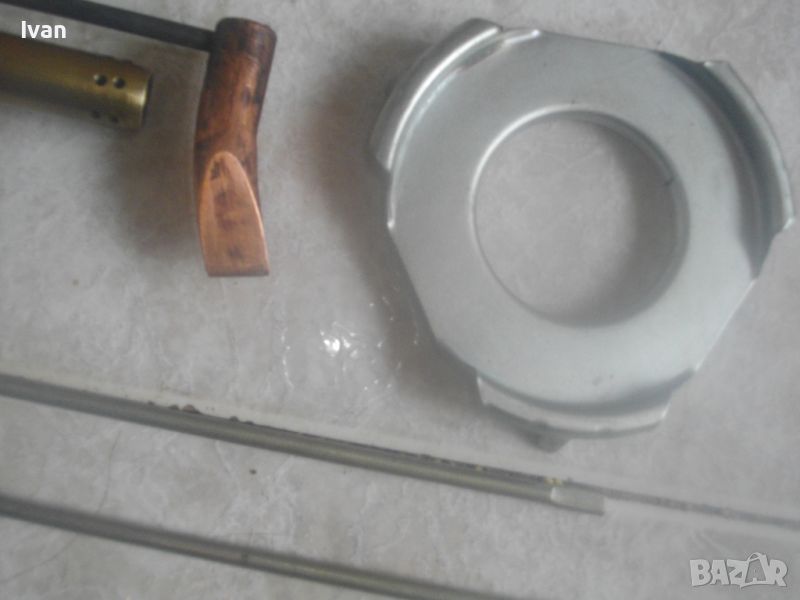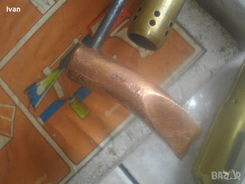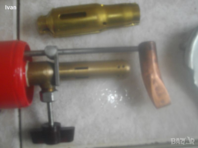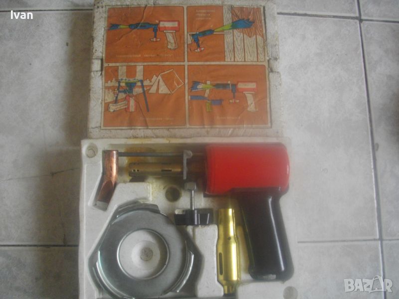 ОПИСАНИЕ на нов руски/съветски бензинов поялник/горелка. Пълен комплект. Нов, неизползван и неупотребяван. Колекционерско състояние. Без забележки. Оригинална съветска/руска кутия от стиропор с хартиените надписи и рисунки за онагледяване на експлоатацията на инструмента. Размери на кутията - 230х180х70мм. Оригинална боя на уреда, без охлузвания. Бакелит дръжка, метален резероар за бензина, бронз глава №288, човка на поялника медна голяма 60 мм, плътна. Спиратенел кран отдолу върток масивен. Размери с поставен поялник 200 мм дължина, дължина надолу към дръжката 150 мм. Резервоар - ф 55 мм. Метална капачка на резервоара. Дифузер дюза горелка бронзова дължа 90 мм - ф 15 мм. В комплекта е включен и пита алуминиев плот за затопляне на храна и напитки посредством горелката, сглобяема чрез трите метални оси в комплекта. Тегло на комплекта с оригиналната кутия от стиропор - 1,5 кг. Твърда/беез коментар.