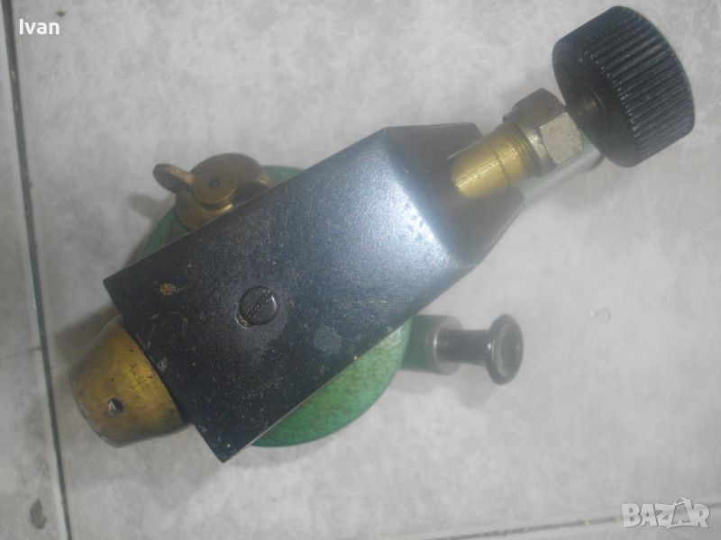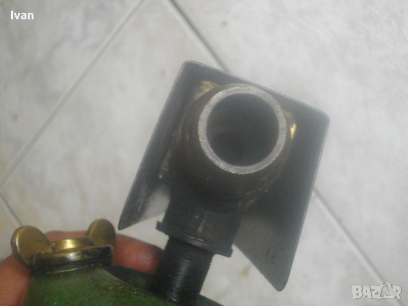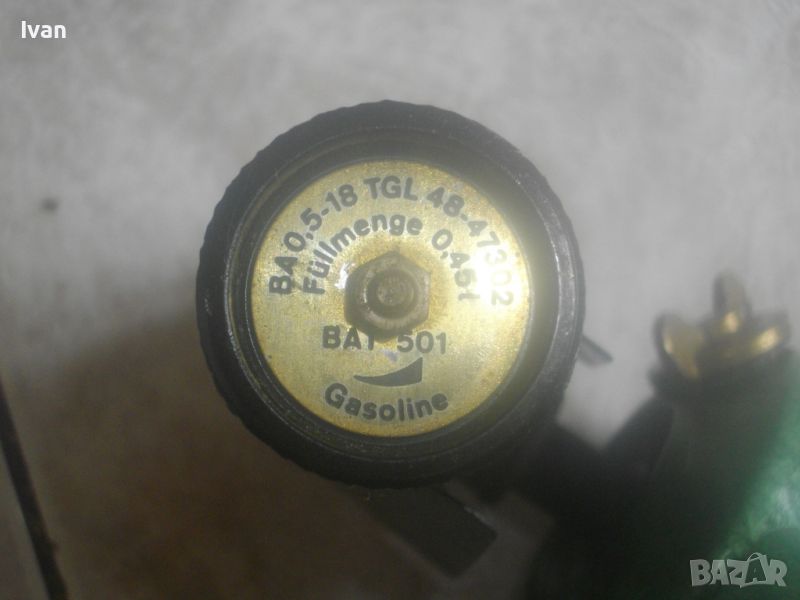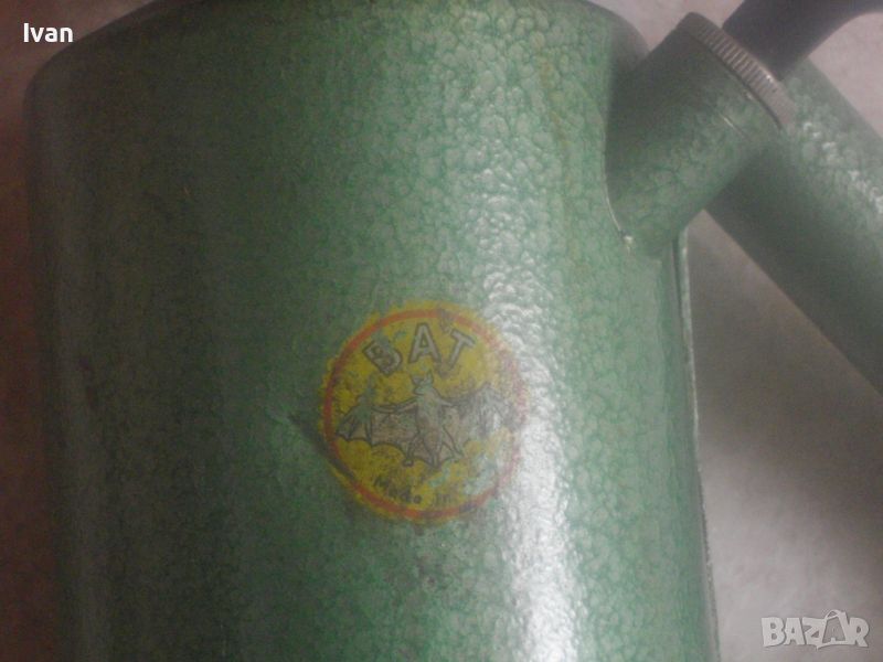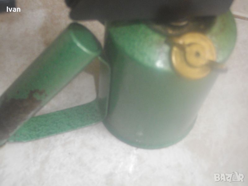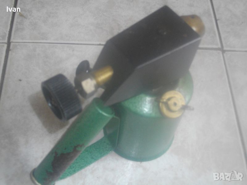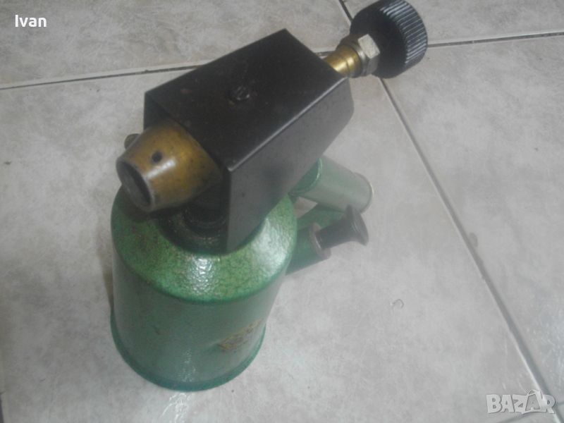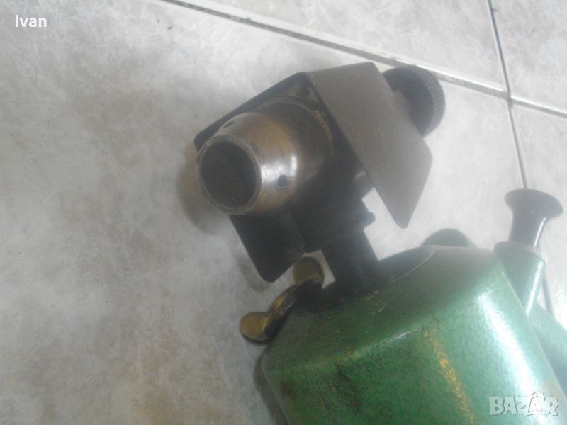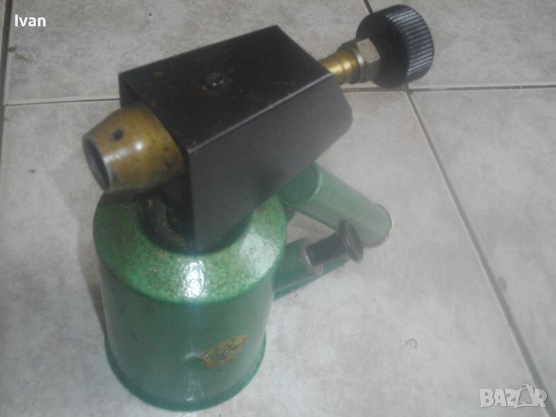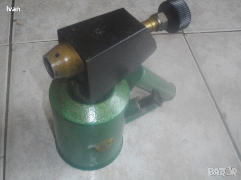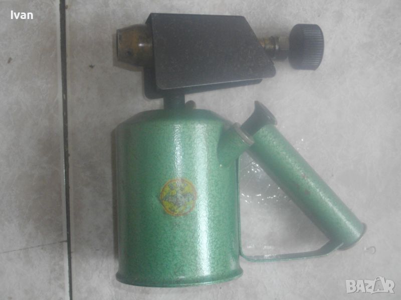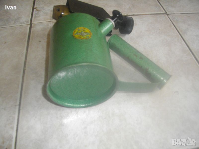 ОПИСАНИЕ на зелена металик цвят бензинова горелка - цена 159 лв. Марка ВАТ с лого на стикера прилеп с разпънати криле. Старо масивно производство Западна Германия. Отлично колекционерско състояние. Много запазен външен вид и добро работно състояние. Метелаен корпус резервоар за бензина с оригинална металик зелена термо боя. Височина на горелката - 180 мм, диаметър резервоар ф 90 мм, дължина назад с дръжката - 190 мм. Метален корпус. Регулатор върток от бакелит. Помпа отстрани. Месингова капачка на горлото на резервоара. Дюза горелка бронзова ф 20 мм. Тегло на горелката - 1,2 кг. Цена 159 лв. Твърда/без коментар.