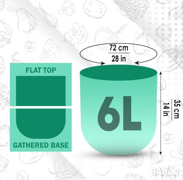 Този пакет включва 160 компостируеми торби и рециклируем картон, гарантиращи нулево замърсяване с пластмаса. Размерът на кошчето е с диаметър 72 см в диаметър, 35 см дължина и капацитет от 6 литра.