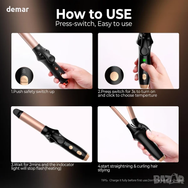 USB Mini Curling Iron е компактно, безжично устройство, идеално за пътуване, включващо три температурни настройки и малка защитна торбичка. Зарежда се лесно, което го прави изключително преносим и идеален за кратки пътувания благодарение на пестящия място дизайн без кабели. Въпреки че малкият му размер може да не е подходящ за тези с дълга или гъста коса, той работи добре за къса до средна дължина на косата, която не е твърде гъста. Освен това, той може да служи и като преса за изправяне, добавяйки към неговата гъвкавост. Тази маша предлага голяма стойност и е отличен избор за леко опаковане.