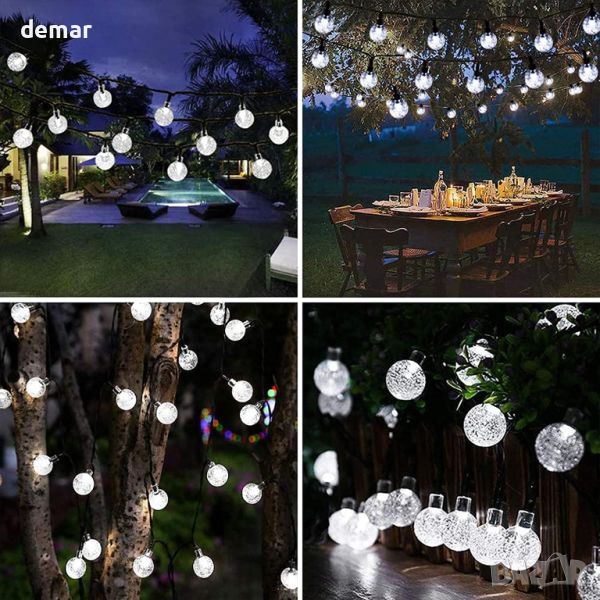 Този комплект от 50 LED глобус феерични светлини разполага с 8 режима на осветяване - Комбинация, Вълни, Последователност, Бавен блясък, Преследване/Светкавица, Бавно избледняване, Блестяща/Светкавица и Постоянно включено - създавайки романтична и уютна атмосфера за всяка обстановка. Надграден с усъвършенстван соларен панел и батерия с голям капацитет от 800 mAh, той постига повече от 20% коефициент на преобразуване на енергия, като гарантира, че 6-8 часа време за зареждане може да захранва светлините за 8-14 часа. Светлините са енергийно ефективни, захранвани от слънчева енергия, автоматично се включват на здрач и се изключват на разсъмване, без разходи за електричество или смяна на батерията. И светлините, и слънчевият панел са водоустойчиви IP65, което ги прави подходящи за вътрешна и външна употреба и устойчиви на атмосферни влияния и късо съединение.