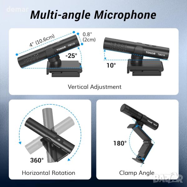 Микрофонът TONOR TM310 разполага със суперкардиоиден насочен модел на улавяне с динамично ядро, което минимизира фоновия шум, оптимизирайки яснотата за предно аудио улавяне. Той включва уникална структура с щипка, която се прикрепя сигурно към всеки компютър или монитор, спестявайки място на бюрото, като същевременно предпазва повърхностите от надраскване. Този plug-and-play микрофон е съвместим с Windows (7, 8, 10, 11), PS4/5, Nintendo и macOS и се доставя с кабели тип C към тип C и тип C към USB A. Той предлага регулируеми ъгли с 360-градусови хоризонтални и -25° до 10° вертикални настройки, подобрявайки прецизността на улавяне на звука. Освен това има комбиниран бутон за заглушаване и намаляване на шума с LED индикатор за лесно управление на аудио настройките.