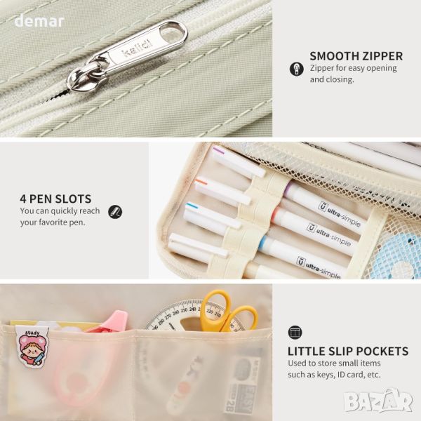 Този уникален моливник има двоен достъп с горен цип и преден капак, оборудван с четири слота за лесен достъп до любимите ви химикалки. Включва и удобна странична дръжка за удобно носене. Изработен от издръжлив, цветен материал, който е щадящ кожата и без химически миризми, този моливник има специално обработени шевове, за да се гарантира, че е безопасен и удобен за използване от деца. С размери от 8,7 x 3,5 x 4,3 инча, той може да побере 80-100 химикалки, както и други основни неща като козметика, калкулатори, транспортири и лепящи се бележки. Два допълнителни малки джоба удобно съхраняват предмети като тиксо, ключове и гуми. Идеален за училище, вкъщи или пътуване, този моливник е страхотен подарък както за момичета, така и за момчета, перфектен за рожден ден, Коледа или друг специален повод, помагайки на децата да останат организирани и да изразят своята личност.