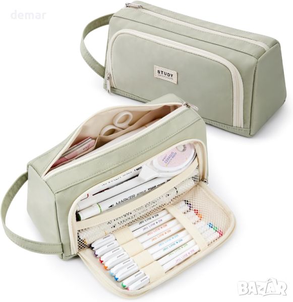 Голям калъф за моливи KALIDI с голям капацитет с цип и отделения, зелен